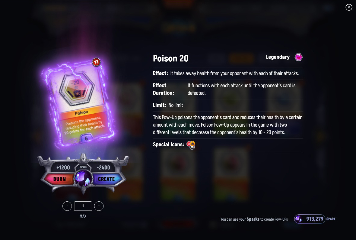In Clashub, under the Inventory and Marketplace tabs, you can view your Spark points. By opening the page of any Pow-UP you wish, you can explore the Spark module. Through this module, you can create Pow-UPs you don't have, and convert less used Pow-UPs into Spark points by burning them.